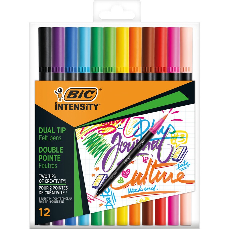 Stylo fibre BIC® Intensity® DualTip pointe robuste en nylon, feutre à 2 fonctions, avec une pointe fine pour les lignes précises et une pointe pinceau conçue pour les traits fins, larges et les surfaces pleines, idéal pour les professionnels du domaine des beaux-arts, pour toutes réalisations créatives, la calligraphie moderne, le brushlettering, le Journaling ainsi que le dessin et le coloriage, encre à base d'eau, capuchon dans la couleur de l'encre, non rechargeable.