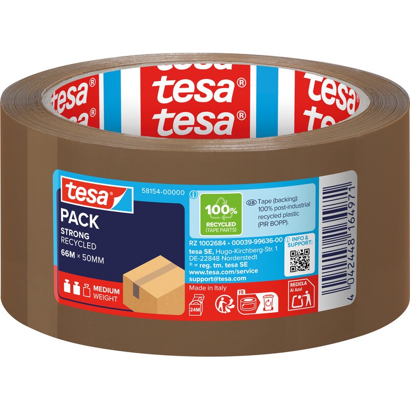 Ruban d'emballage TESA® eco & strong film support 100% en PP recyclé, bague 100% en carton recyclé, label attestant d'un papier biologique, très résistant et fort pouvoir adhésif, résistance élevée aux UV et à l'usure, déroulement régulier et silencieux, sans solvant. Durabilité eco:plus: recyclable, composant recyclé, teneur en déchets recyclés avant utilisation max. 100%, emballage respectueux de l'environnement. neutre