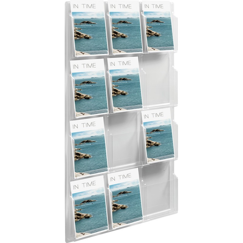 Présentoir mural HELIT the clearly en PETG, fabrication monobloc, profondeur des casiers 46 mm. Durabilité eco:plus: durée de vie du produit prolongée, recyclable, teneur en déchets recyclés après utilisation max. 100%, réduction des déchets. pour format A4