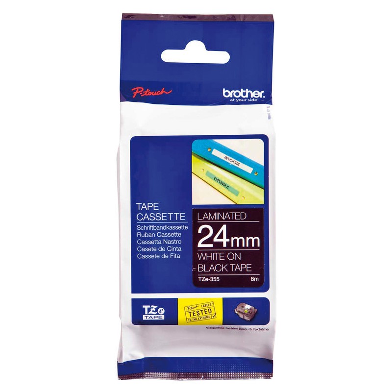 Ruban BROTHER P-touch TZe laminé résiste à l'essuyage, étanche et antirayures, résiste aux températures extrêmes et aux UV, pour la maison, le bureau et le lieu de travail. largeur 24 mm, longueur 8 m