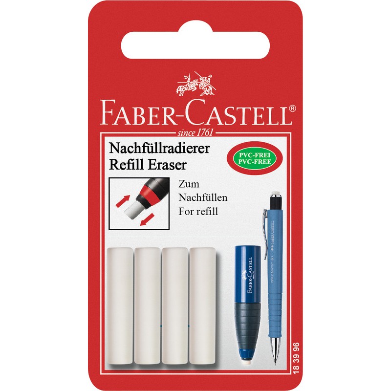 Gommes de rechange FABER-CASTELL pour combinaison gomme/taille crayons 184400 et crayon gomme 183997, sans PVC. Blister de 4 pièces. Durabilité eco:plus: emballage respectueux de l'environnement.