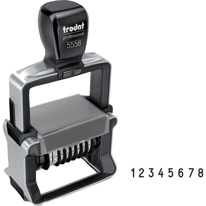 Numéroteur à bandes, à encrage automatique TRODAT® Professional(TM) 4.0 boîtier métallique gainé de plastique. Durabilité eco:plus: composant recyclé, teneur en déchets recyclés avant utilisation max. 57%, teneur en déchets recyclés après utilisation max. 6%. Certification: EU Ecolabel.