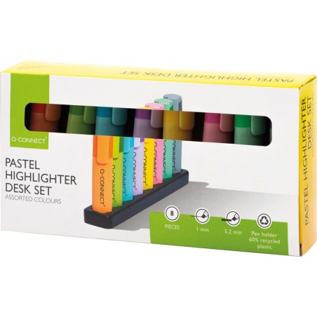Surligneur Q-CONNECT® Pastel Desktop, étui en carton pointe biseautée, encre universelle à base d'eau, convient pour tous les papiers usuels, non rechargeable, largeur de trait env. 1 - 5,2 mm, couleurs assorties, orange, jaune-vert, bleu, violet, jaune, rose, vert et gris. Etui en carton de 8 pièces. Durabilité eco:plus: recyclable, composant recyclé, teneur en déchets recyclés avant utilisation max. 30%, emballage respectueux de l'environnement.