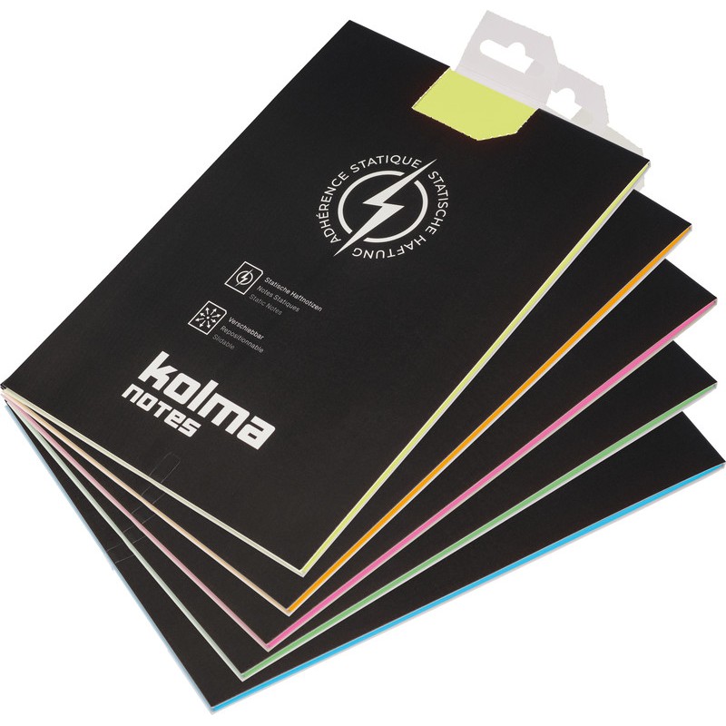 Notes adhésives KOLMA® Notes notes adhésives à charge statique sur toutes les surfaces propres, les feuilles sont faciles à repositionner, verso blanc inscriptible et effaçable à sec, utilisables recto verso, conviennent pour des notes, présentations et remue-méninges. Durabilité eco:plus: recyclable, teneur en déchets recyclés après utilisation max. 100%. format: 148 x 210 mm couleurs assorties, vert néon, bleu néon, jaune néon, orange néon et rose