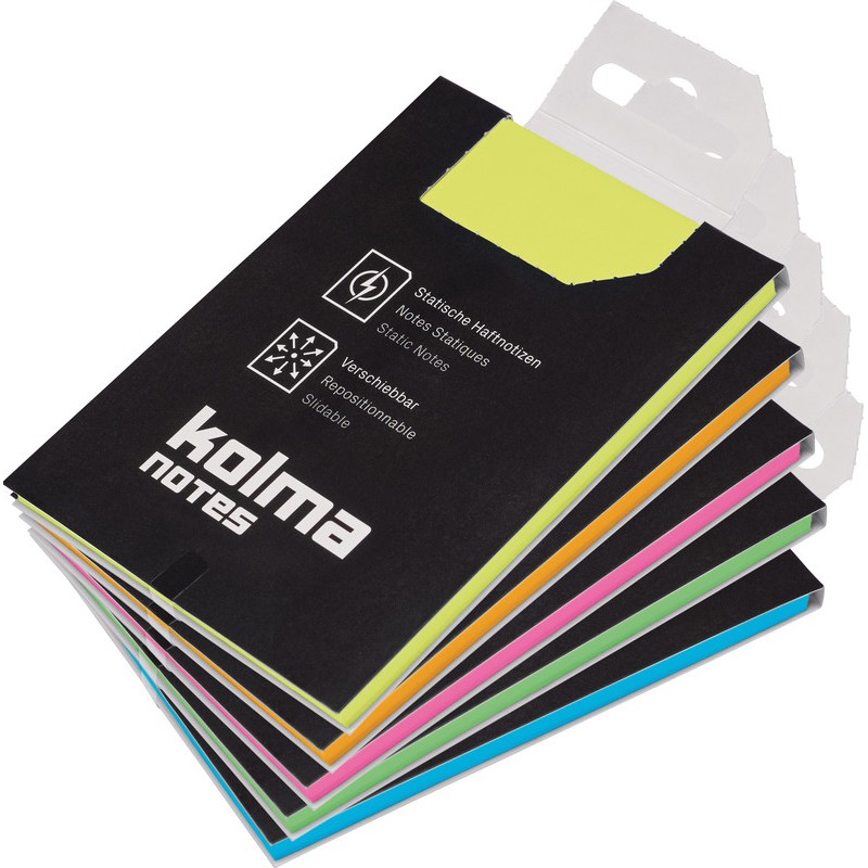 Notes adhésives KOLMA® Notes notes adhésives à charge statique sur toutes les surfaces propres, les feuilles sont faciles à repositionner, verso blanc inscriptible et effaçable à sec, utilisables recto verso, conviennent pour des notes, présentations et remue-méninges. Durabilité eco:plus: recyclable, teneur en déchets recyclés après utilisation max. 100%. format: 74 x 105 mm couleurs assorties, vert néon, bleu néon, jaune néon, orange néon et rose