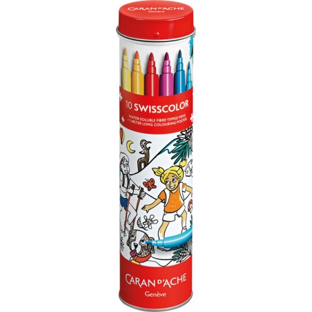 Feutres de coloriage CARAN D'ACHE Swisscolor(TM) feutre soluble à l'eau à base de colorants alimentaires, couleurs lumineuses, pointe résistante, souple et indéformable, couleur lavable, peut rester ouvert jusqu'à une semaine sans sécher. Standard, dans boîte en métal avec affiche set de 10 feutres de coloriage Standard, couleurs assortis et affiche «La Suisse au fil des saisons», format 980 x 150 mm.