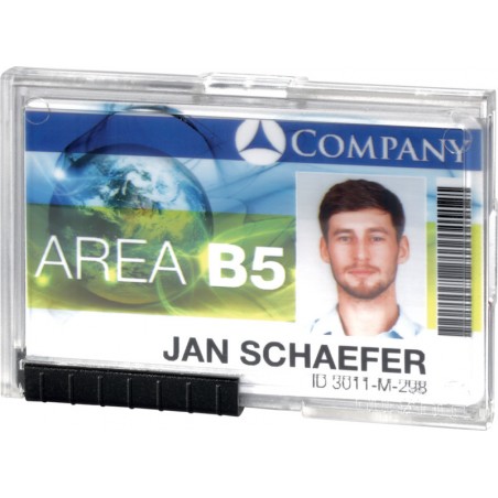 Porte-badges DURABLE Pushbox retrait individuel des cartes grâce au bouton-poussoir, des compartiments individuels protègent p. ex. les cartes avec bande magnétique d'un endommagement, utilisation au format portrait ou paysage, peut être combiné avec une chaînette, un clip, un ruban textile ou un enrouleur. Dimensions: L 87 x H 54 mm. Emballage de 10 pièces. Durabilité eco:plus: recyclable.