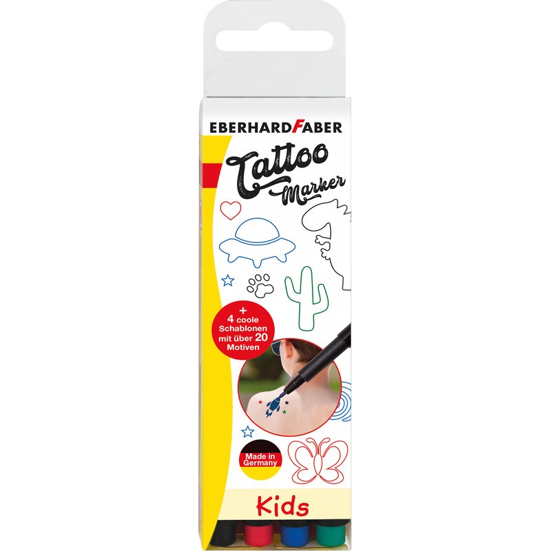Marqueurs à tatouages EBERHARD FABER Body Marker s'enlève à l'eau et au savon, lavable sur la plupart des textiles, testé dermatologiquement, dès 5 ans. set de 4 pièces