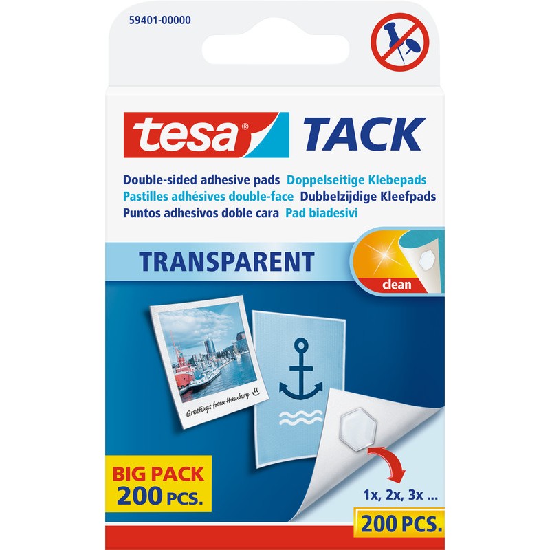 Pastilles adhésives double face TESA® TACK transparentes, pour la fixation de papier et d'objets légers, se retirent sans laisser de traces, réutilisables.