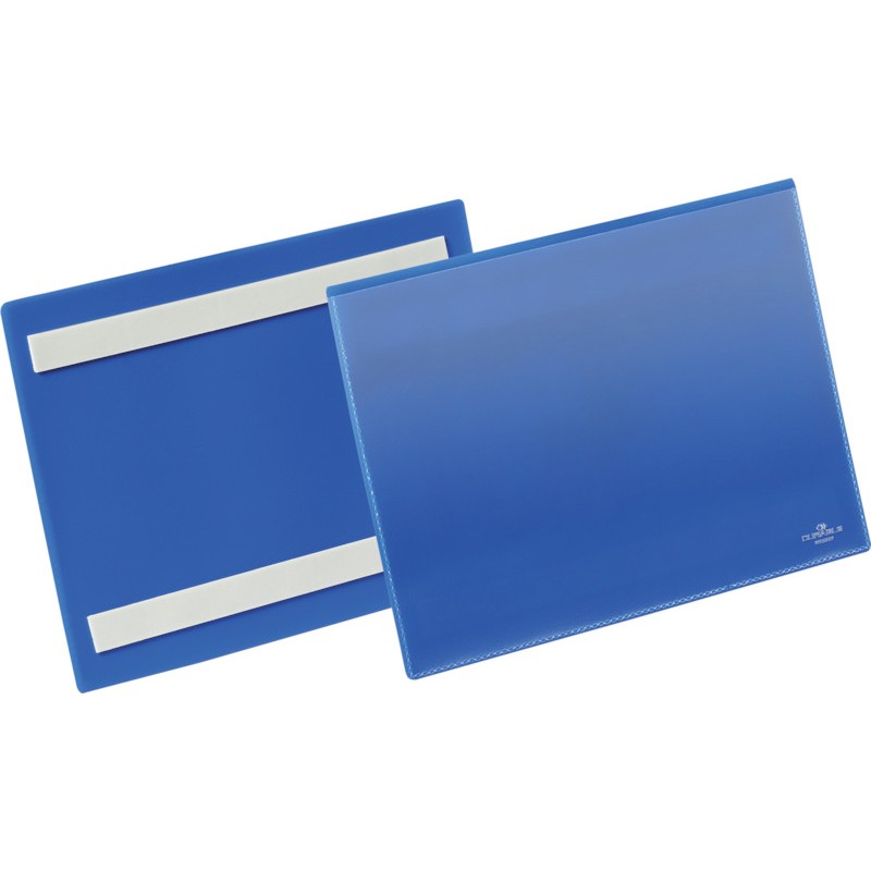 Pochettes signalétiques DURABLE adhésives équipées de 2 bandes adhésives au dos, application sur des conteneurs en plastique, du bois et des cartonnages, dos de la pochette bleu, rabat en PP bleu et transparent, scannage des étiquettes possible, n'altèrent pas les documents, inscription facile avec le logiciel d'étiquetage gratuit Duraprint® sur www.duraprint.fr. Emballage de 50 pièces.