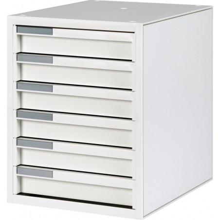 Module à tiroirs STYROKAY en PS, avec matériel d'inscription, caisson et tiroirs blancs, pour format A4. Dimensions extérieures: L 270 x H 340 x P 345 mm.