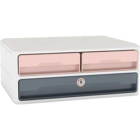 Module à tiroirs CEP MoovUp Secure en PS résistant aux chocs, en plastique recyclé (min. 80% de matériaux de postconsommation), avec 4 tiroirs, 1 tiroir standard et 2 tiroirs demi, tous les tiroirs peuvent être verrouillés à clé, livré avec 2 clés, empilable, tiroirs avec butées d'arrêt, charge max. 5 kg, protection antivol supplémentaire par serrure à câble (câble non fourni), pour format A4+. Dimensions extérieures: L 274,5 x H 146 x P 368,5 mm.