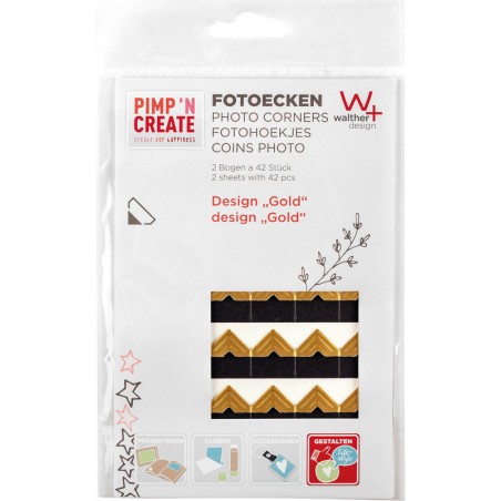 Coins photos WALTHER Pimp 'N Create autocollants, sans solvant, résiste au temps, format 18 x 20 mm. Blister de 2 feuilles avec 42 coins photo chacune. Durabilité eco:plus: recyclable, emballage respectueux de l'environnement.