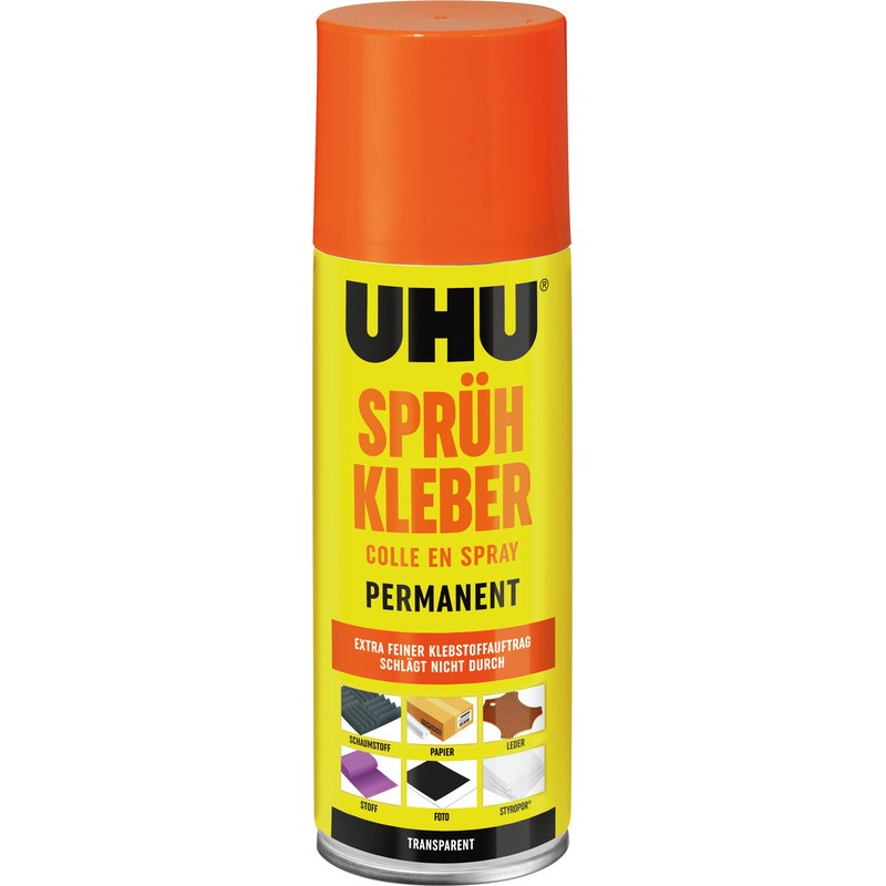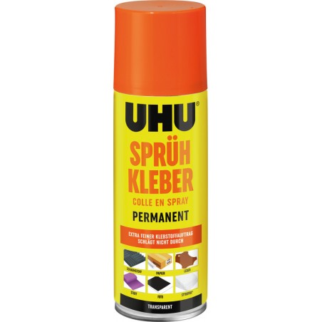 Colle aérosol UHU® permanente rapide, puissante et propre, application uniforme, idéale pour le collage de grandes surfaces de matériaux différents (même le polystyrène), transparente, le pulvérisateur ne se bouche pas.