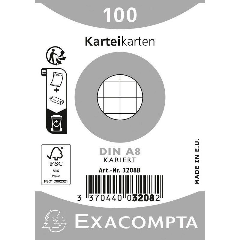 Cartes-fiches EXACOMPTA quadrillées en carton, 205 g/m2. Emballage de 100 pièces. Durabilité eco:plus: Certification: PEFC.