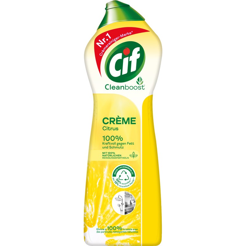 Nettoyant multiusage CIF® Crème Citrus avec microparticules, élimine efficacement les salissures, les dépôts de calcaire et de graisse, appliquer la crème, frotter avec une éponge humide, puis rincer, ne pas utiliser sur les surfaces peintes ni les matières plastiques délicates, parfum citron.