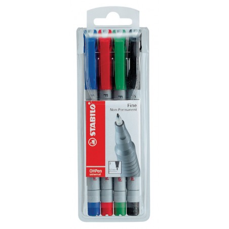 STABILO® OHPen universel soluble à l'eau clip, stylo-feutre pour transparents, destiné à une utilisation universelle, car ce feutre convient à pratiquement toutes les surfaces lisses, encre soluble à l'eau, effaçable à l'aide d'un chiffon humide, non rechargeable. Durabilité eco:plus: emballage respectueux de l'environnement. fin (F), largeur de trait env. 0,7 mm