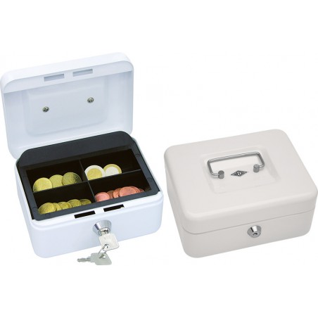 Caissette à monnaie WEDO® en métal thermolaqué, poignée escamotable, monnayeur en plastique, serrure à barillet et 2 clés. grandeur 1, 4 casiers à monnaie dimensions: L 152 x H 80 x P 115 mm.