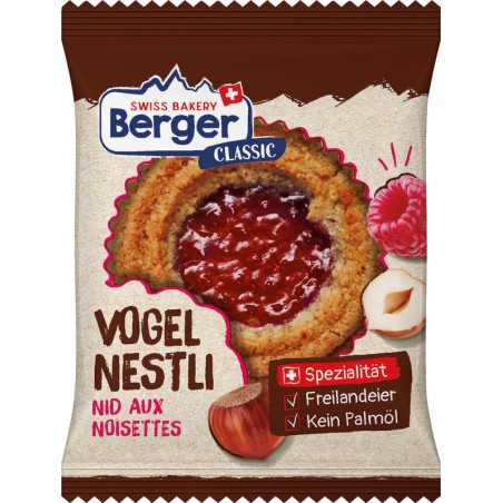 Gâteaux secs BERGER nid aux noisettes fond de pâte brisée tendre recouvert de confiture de framboises, entouré d'un anneau de noisettes.