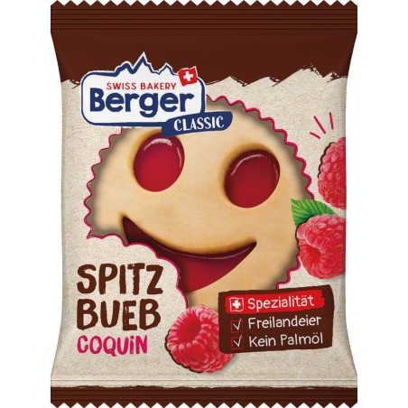 Gâteaux secs BERGER coquin biscuits sablés tendres, fourrés d'une confiture de framboise.