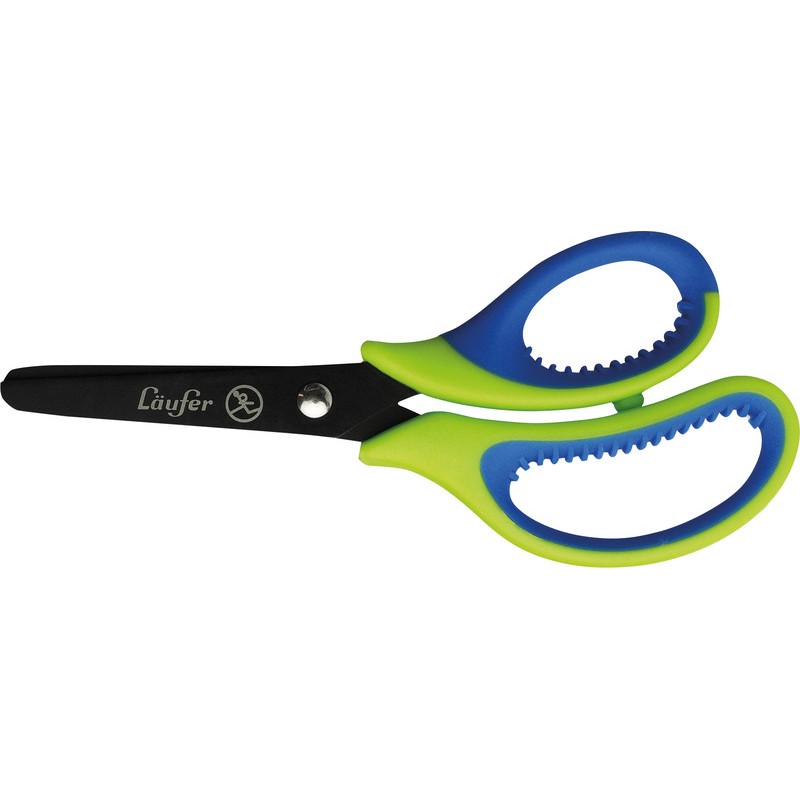 Ciseaux pour enfants LÄUFER® en acier inoxydable, pour droitiers, en acier inoxydable, anneaux ergonomiques et douces, lame arrondie noire avec graduée en cm, revêtement en titane, longueur 13 cm.