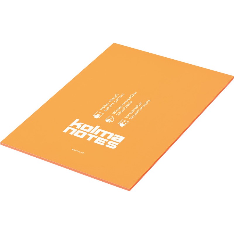 Notes adhésives KOLMA® Notes notes adhésives à charge statique sur toutes les surfaces propres, les feuilles sont faciles à repositionner, verso blanc inscriptible et effaçable à sec, utilisables recto verso, conviennent pour des notes, présentations et remue-méninges. Durabilité eco:plus: recyclable, teneur en déchets recyclés après utilisation max. 100%. format: 148 x 210 mm