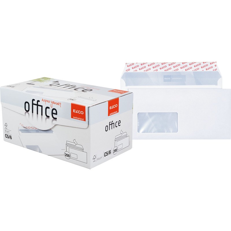 Enveloppes ELCO Office, petit emballage de bureau qualité premium extra-blanche, sans chlore, intérieur gris, couleur 100% à base d'eau. Durabilité eco:plus: recyclable. Certification: FSC. C6/5, avec fermeture autoadhésive Optifix® 229 x 114 mm, façon DNG-HK. Boîte de 200 pièces.