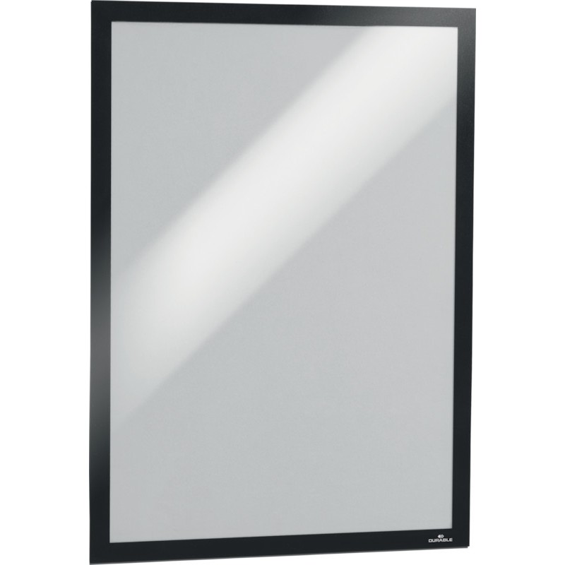 Cadres d'affichage DURABLE Duraframe® autocollants, actualisation simple et rapide des informations grâce au contour magnétique, adhèrent durablement sur toutes les surfaces courantes, se retirent et se repositionnent facilement sur toutes les surfaces lisses et rigides comme le verre, conviennent pour l'affichage d'informations, d'instructions, de tarifs, etc., lisibilité recto verso, s'utilisent au format portrait ou paysage. Emballage de 2 pièces.