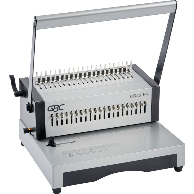 Perforelieuse à peignes plastiques GBC® CombBind® C25Pro perforelieuse manuelle, capacité de perforation env. 25 feuilles, jusqu'au format A4 haut et A3 oblong, pas US 21 anneaux, convient pour peignes plastiques jusqu'à 51 mm de Ø (env. 500 feuilles), 21 poinçons débrayables séparément pour des formats spéciaux, avec réglage de la profondeur de perforation et butée réglable. Dimensions: L 617 x H 250 x P 350 mm. Poids: 14,5 kg.