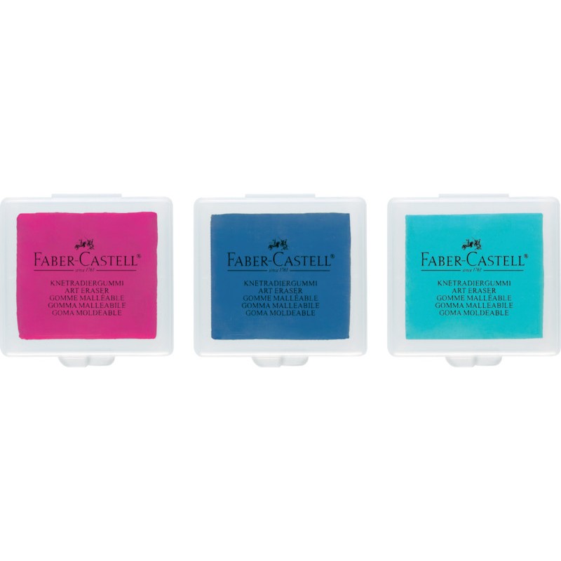 Gomme mie de pain FABER CASTELL Art Eraser facilement déformable et absorbante, pour corriger et éclaircir les dessins au fusain et au pastel, mais aussi pour le nettoyage des films plastique et des esquisses, sans PVC, dans une boîte transparente. Dimensions: L 38 x H 8 x P 35 mm.