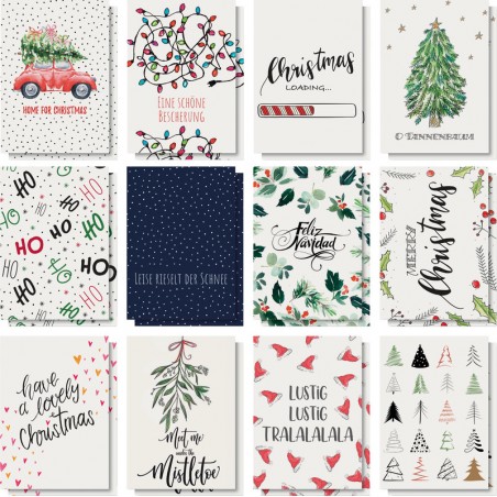 Cartes postales SIGEL Noël texte en anglais et en allemand, 12 motifs assortis, format A6. Set de 24 pièces. Pour copieurs, copieurs couleur, imprimantes laser, jet d'encre et laser couleur. Durabilité eco:plus: recyclable. en bristol 270 g/m2.