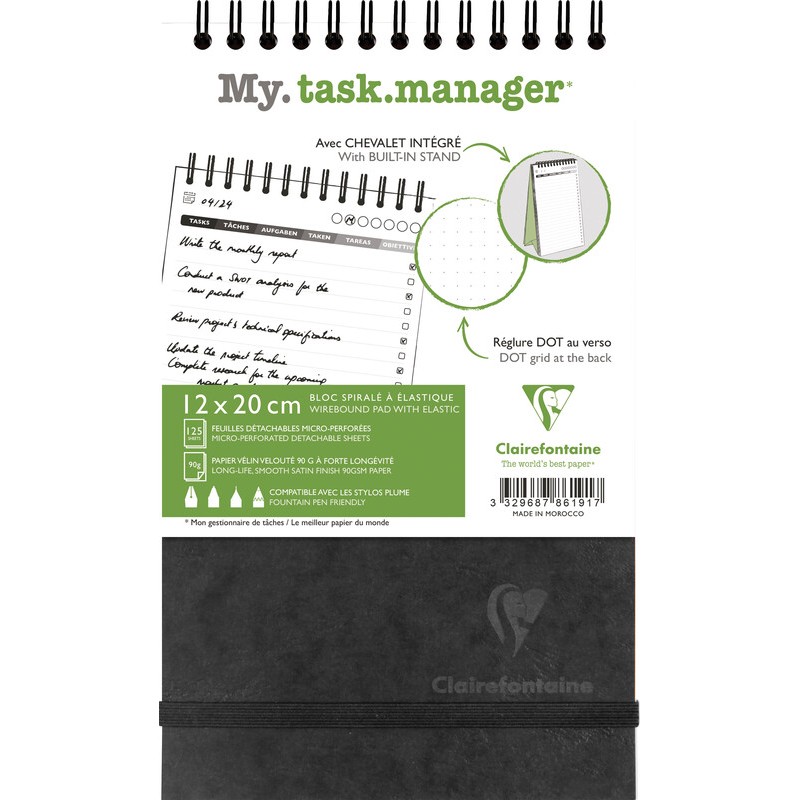 Planning CLAIREFONTAINE AgeBag Task M sans date, 90 g/m2, verso avec grille de pointillés, 250 pages, perforé, couverture en carton, grainé avec structure en cuir, durable et résistant, avec support intégré, fermeture par élastique, reliure spirale, pour l'organisation des tâches, la fixation des idées, etc. Format: 120 x 200 mm.