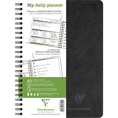 Planning CLAIREFONTAINE AgeBag my Daily sans date, 1 jour sur 2 pages, 90 g/m2, couverture en carton, grainé avec struture en cuir, durable et résistant, page de gauche offre de la place pour inscrire les priorités, les repas, les activités, etc., à droite il est possible d'ajouter le déroulement de la journée, 250 pages, perforé, reliure spirale. Dimensions: L 148 x H 210 mm.