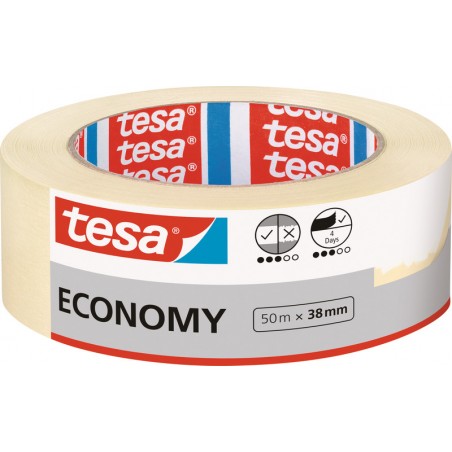 Ruban de masquage en papier crêpe TESA® Economy pour des travaux de peinture et de masquage standard à l'intérieur, s'enlève sans laisser de traces dans les 4 jours, sans solvant. Durabilité eco:plus: recyclable.
