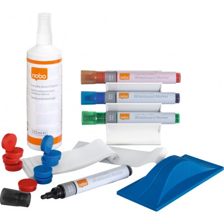 Starter-Kit NOBO® pour tableaux blancs set composé de 4 marqueurs NOBO® Liquid Ink de couleurs assorties, rouge, bleu, vert et noir, effaceur magnétique pour tableaux blancs, 5 feutres de rechange pour effaceur, porte-marqueurs magnétique, spray nettoyant NOBO® 125 ml, 10 chiffons de nettoyage secs et 10 aimants NOBO® Ø 25 mm.