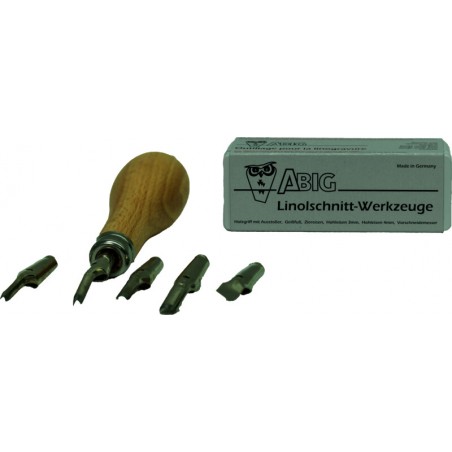Outils pour la linogravure ABIG set composé d'un manche en bois, d'un extracteur de gouge pour un remplacement rapide et aisé des gouges, de 5 gouges en acier trempé, affûtées à la main, nickelées: gouge en forme de V, gouge à décorer en forme de U, couteau à détourer et gouges en forme de U 3 et 4 mm, dans une solide boîte en plastique.