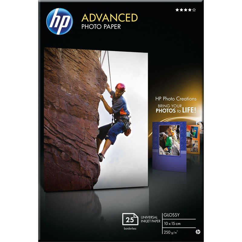 Papier photo jet d'encre HP Advanced, ultrabrillant papier photo à finition brillante à séchage instantané et résistant à l'eau, pour l'impression de photos de qualité professionnelle aux couleurs vives, les photos gardent leur élasticité et leur éclat même en présence d'une forte humidité, idéal pour les instantanés, tirages de contrôle et la multicopie, sans languette détachable. Pour imprimantes jet d'encre. Emballage de 25 feuilles.