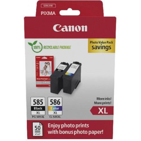 CANON Photo Value Pack 585XL/586XL papier photo brillante, 200 g/m2, format 100 x 150 mm. Pour imprimantes jet d'encre. Emballage avec 2 cartouches d'encre et 50 feuilles papier photo.