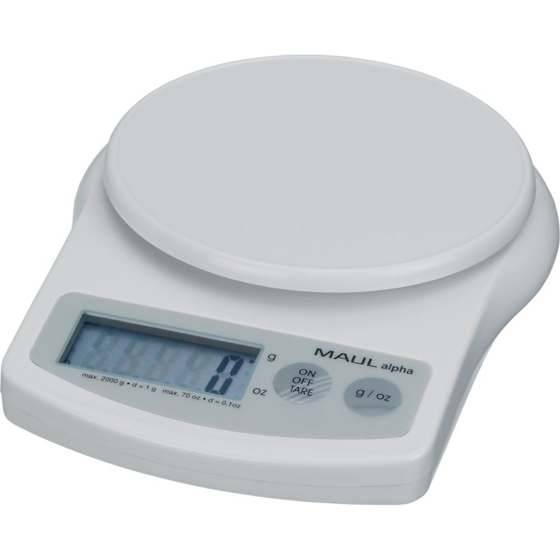 Pèse-lettres MAUL alpha en PS incassable, remise à zéro automatique, une touche pour toutes les fonctions: on/off/tare, affichage commutable en g ou oz, charge minimale 2 g, alimentation par 2 piles AAA Micro 1,5 V (fournies), arrêt automatique, calibrage utilisateur possible. Dimensions: L 141 x H 37 x P 188 mm, plateau: Ø 124 mm. Prix incluant la TAR. graduation: 1 g jusqu'à 2000 g