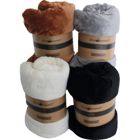 Couverture DORA SOMMER automne en 100% PES, doux et duveteux, lavable à 40°C, couleurs assorties écru, gris, brun et noir. Dimensions: L 150 x H 200 cm.