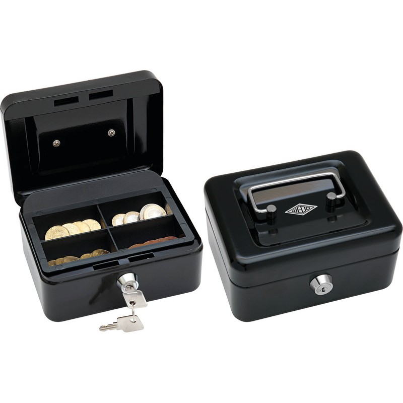 Caissette à monnaie WEDO® en métal thermolaqué, poignée escamotable, monnayeur en plastique, serrure à barillet et 2 clés. grandeur 1, 4 casiers à monnaie dimensions: L 152 x H 80 x P 115 mm.