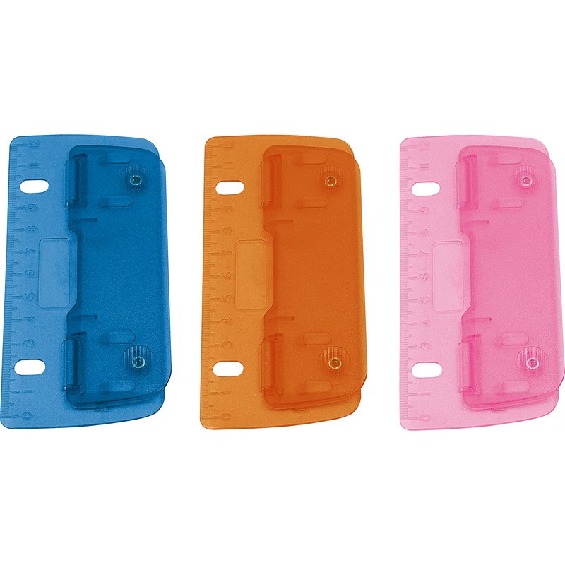 Perforateur de poche WEDO® en plastique, poinçons en métal pour perforation 8 cm, réglette, graduation en cm, peut être rangé dans un classeur, capacité de perforation env. 0,3 mm (3 feuilles), couleurs assorties, bleu, orange et rose. Dimensions: L 67 x H 8 x P 129 mm.