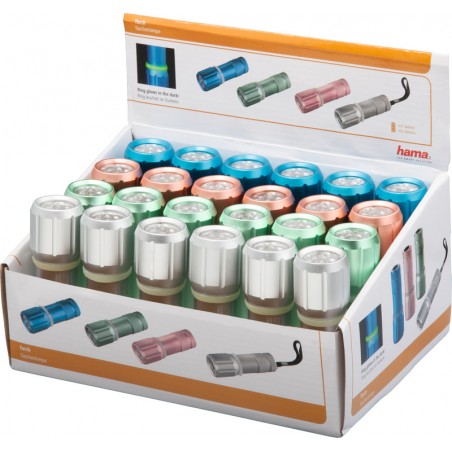 Lampe de poche LED HAMA FL-50 boîtier en aluminium à l'aspect métallique, anneau phosphorescent qui brille dans l'obscurité, 9 LED, faible consommation d'énergie, éclairage uniforme de la surface, résiste aux chocs grâce, avec dragonne noire. Alimentation: 3 piles AAA (fournies). 4 couleurs assorties, bleu turquoise, corail, vert pâle et argent. Dimensions: L 97 mm, Ø 33 mm. Poids: 88 g. Durabilité eco:plus: construit pour être démontable, recyclable.