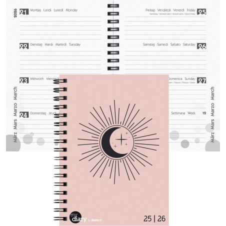 Agenda scolaire BIELLA mydiary Wire-O 1 semaine sur 2 pages, couverture PP Cylar® et papier imprimé, calendrier en 4 langues all./fr./it./angl., août à juillet, ligné travers, avec pages annuelles et mensuelles, pages d'information, grand espace pour notes, coins perforés, reliure Wire-O. Durabilité eco:plus: Certification: FSC. format: 12 x 16,5 cm Trend 2025/2026
