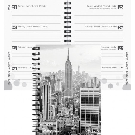 Agenda scolaire BIELLA mydiary Wire-O 1 semaine sur 2 pages, couverture PP Cylar® et papier imprimé, calendrier en 4 langues all./fr./it./angl., août à juillet, ligné travers, avec pages annuelles et mensuelles, pages d'information, grand espace pour notes, coins perforés, reliure Wire-O. Durabilité eco:plus: Certification: FSC. format: 12 x 16,5 cm City