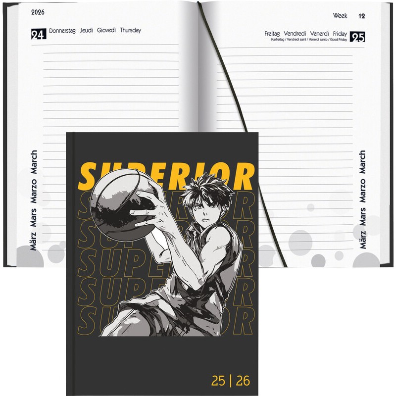 Agenda scolaire BIELLA mydiary 1 jour par page, couverture recouverte de papier imprimé et laminé, calendrier en 4 langues all./fr./it./angl., août à juillet, ligné travers, avec pages annuelles et mensuelles, pages d'information, grand espace pour notes, coins perforés, signet, format: 12 x 16,5 cm. Durabilité eco:plus: Certification: FSC. Sport 2025/2026