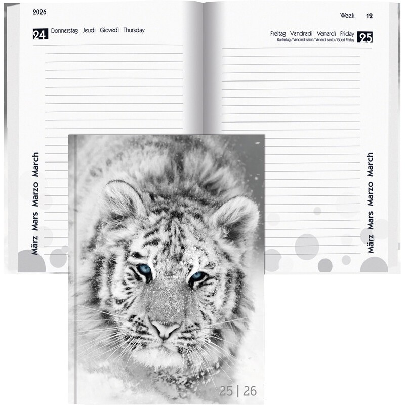 Agenda scolaire BIELLA mydiary 1 jour par page, couverture recouverte de papier imprimé et laminé, calendrier en 4 langues all./fr./it./angl., août à juillet, ligné travers, avec pages annuelles et mensuelles, pages d'information, grand espace pour notes, coins perforés, signet, format: 12 x 16,5 cm. Durabilité eco:plus: Certification: FSC. Black & White ouatinée 2025/2026