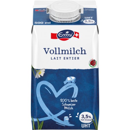 Lait entier EMMI UHT 3,5% de matière grasse, lait entier standardisé.