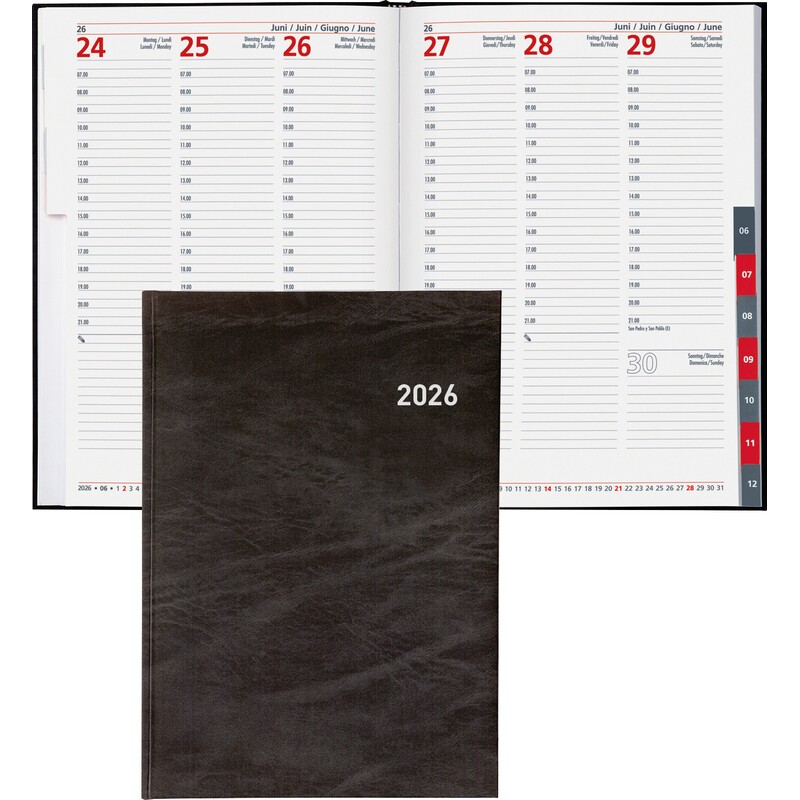 Agenda commercial BIELLA Registra 7 plus 1 semaine sur 2 pages, couverture en similicuir, marbré en couleur, ouatinée, calendrier en 4 langues all./fr./it./angl., ligné travers, division horaire (07.00 - 21.00 heures), pages annuelles et mensuelles supplémentaires, pages de notes, chaque page avec calendrier mensuel et espace pour notes, découpe répertoire, format: 17,2 x 24 cm. Durabilité eco:plus: Certification: FSC. noir