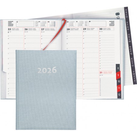 Agenda commercial BIELLA Orario® 1 semaine sur 2 pages, couverture ouatinée, calendrier en 4 langues all./fr./it./angl., ligné travers, division horaire (07.00 - 20.00 heures), pages annuelles et mensuelles supplémentaires, pages de notes, chaque page avec calendrier mensuel, répertoire d'adresses interchangeable, découpe répertoire, signet, format: 17,8 x 23,5 cm. Durabilité eco:plus: Certification: FSC. couverture optique lin bleu clair